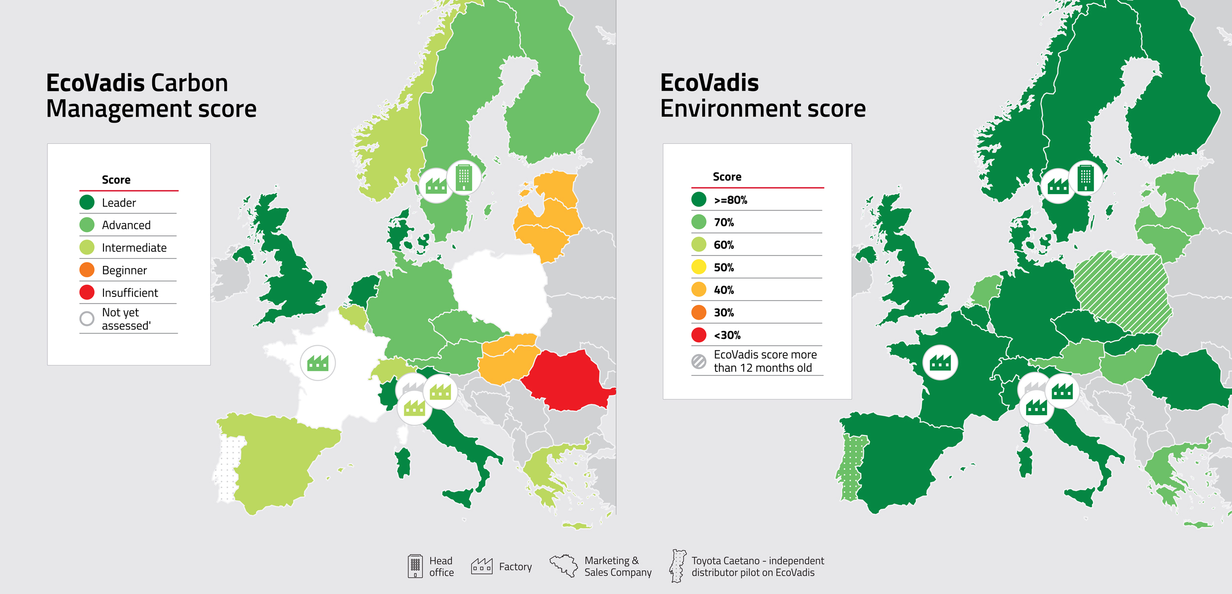 EcoVadis' vurdering er en afgørende del af vores bæredygtighedsstrategi, og vi er forpligtet til at fremme ESG-overholdelse og bedste praksis på tværs af vores egne aktiviteter. Derfor gennemfører vi EcoVadis-undersøgelsen en gang om året på hovedkontorniveau, og vi beder alle fabrikker og marketing- og salgsselskaber om at gøre det samme.