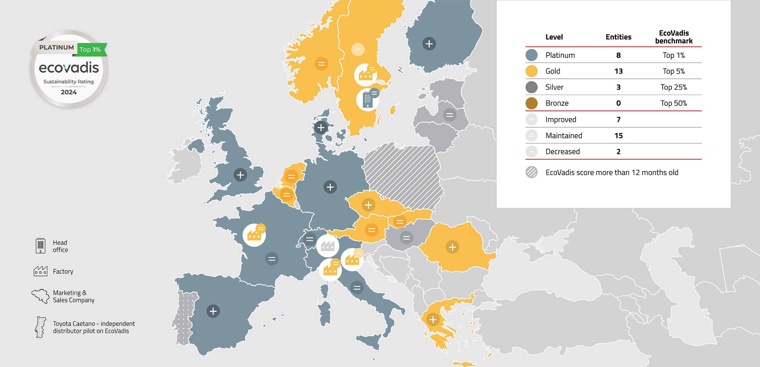 Alle vores fabrikker har nu nået EcoVadis Gold-niveau, og 85 % af vores marketing- og salgsselskaber er på enten Platinum- eller Gold-niveau.